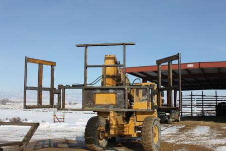 Sasser used scrap iron and parts from an old land leveler and a Case disk plow to build his “powered” bale fork. It consists of a pair of squeeze arms attached to a long rectangular steel backstop, which quick-attaches to the extend-a-boom forklift on Sasser’s Cat loader. A pair of hydraulic cylinders move the squeeze arms inward to grasp the bale in a tight hug.