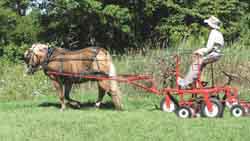 Recognizing a growing interest in raising mini horses, he and a welder designed the Mini Gang Mower, which makes a 21-in. cut and comes with shafts in two sizes for a mini horse or small pony. The mower has a seat and foot pedal steering.