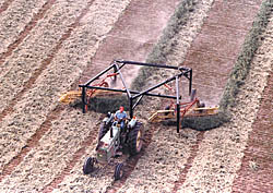 Kuhn says the hitch design allows him to minimize running his tractor wheels over the swaths. "I use the hitch to affect four swaths at a time. If I want I position the rakes to move two swaths onto two other swaths, and keep going back and forth that way until I reach the center of the field. Then I reverse the rakes and go back the other way. That way, the first windrow I raked was my wettest but by the time I get done the driest hay goes onto that same windrow. It lets me 'average out' the moisture without raking hay that's either too wet or too dry."