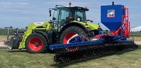 “Just turn on the fan, and it blows the product from the tank, dispersing it evenly across the frame in front of the rotary wheels about 12 in. off the ground,” he says. “The wheels agitate the ground to provide the optimal seed-to-soil contact. They’re also adjustable on the third link of the 3-pt. hitch for aggressiveness.”