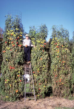 In his book, How to Grow World Record Tomatoes, the Alabama gardener describes his pruning plan, as well as planting, watering and all-organic plant feeding techniques. The garden consultant uses 3-ft. diameter cages. His pruning technique makes it work.