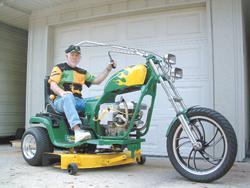 Painted Deere green and yellow, the 3-wheeled "easy rider" mower was built from the back half of a Deere STX 38 riding mower and the front half of a Honda 750 motorcycle. It has a 38-in. belly-mount deck that's powered by a horizontally opposed 18 hp Briggs & Stratton gas engine. The mower has dual headlights, brake lights, and dual stainless steel exhaust pipes that make the rig sound like a Harley Davidson motorcycle. The driver sits on a "king queen" motorcycle seat.