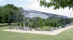 The idea is surprisingly simple. Take a greenhouse frame, cover it with bird netting, and add doors. That's it.