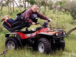 The full-length "seat" lifts a person up from a wheelchair into operating position above the controls, laying facedown. The seat was developed by Bill Green of Airdrie, Alta. He removed the seat and rear cargo rack from an Arctic Cat 500 4-wheeler. His add-on seat is operated by electric-powered linear actuators that slide up or down on a pair of stainless steel rails. The operator brings the seat down to its lowest position, then kneels on a padded "beavertail" knee rest and straps on a seat belt equipped with a back support. At the touch of a switch, the seat moves up into the driving position. Another switch is used to adjust the angle of the "beaver tail" knee rest, and a third switch changes the driver's angle of incline for traveling up or down slopes.