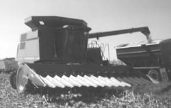 The 16-row, 15-in. header was built by Junior and Richard Rea of Hamilton, Ill., with the help of neighbor John McIlmoil. It mounts on their Deere 9600 combine and was patterned after a header designed by Alpha, Ill., farmer-researcher Marion Calmer, with just one gathering chain per row.