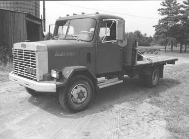 Larson bought the Iveco truck used and mounted a home-built flatbed on it. When the cab rusted out, he found a 1979 Autocar cab off a dump truck. The cab was longer than the Iveco cab so he removed the original truck frame and replaced it with a longer one off another used Iveco truck. He made a new front end, and also made a new hood, fenders, grille, muffler, and installed a set of headlights designed for snowplows. He also replaced the truck's original hydraulic brakes with air brakes.