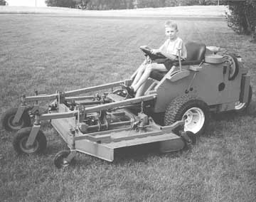 "I built the power unit from scratch, using 2-in. square tubing for the frame. It's fitted with a Wisconsin 4-cyl. air-cooled engine that's mounted behind and below the driver. It connects up to a variable-speed, belt-driven transmission salvaged from a swather. The transmission is controlled by a lever up front. I used a cone clutch connected hydraulically to the clutch pedal. I also used a 3-speed transmission salvaged from a small car for forward and reverse gears. A differential from a Toyota car drives the axle. The front axle is fitted with a pair of wide 23 by 9.5 by 12-in. tires while the rear is equipped with a single 22.5 by 7.5 by 12-in. tire for steering. A Toyota steering wheel connects to the rear wheel by cable and roller chain. The steering wheel and its shaft lift out easily when getting on or off the mower.