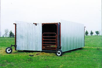 The calf shelter consists of a 12-ft. wide, 24-ft. long, 7-ft. high enclosed barn and two 24-ft. long, 8-ft. high wings that are hinged where they attach to the barn. The wings fold out to form a windbreak. Both the barn and wings are made from corrugated steel screwed onto a frame made from sq. steel tubing. Calves enter the barn through 38-in. high, 4-ft. wide holes cut into both side walls. The end of the barn opposite the windbreak is partially open and has a steel gate across it.