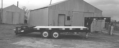 "It works as well as any commercial implement trailer on the market and cost only little to build," says Allen Rollins, Motley, Minn., about the tandem axle gooseneck implement trailer he built using the frames from a pair of old school buses. The trailer, which measures 8 ft. 4 in. ft. wide and 20 ft. long, has a wooden floor and a sloped steel tail on back equipped with a pair of hinged steel loading ramps that can be manually raised out of the way for travel. Either a hand-operated winch or a 2-speed electric winch is used to pull equipment up onto the bed. Rollins bought two buses for a total of. He used the 10-in. wide frame rails off one bus as the frame for the trailer and the 9-in. frame off the other bus to make most of the gooseneck hitch. He bought two 7,000-lb. axles and mounted used 85R by 16 tires on the wheels. In order to fit the axles he widened the trailer frame out to 66 in. To make the gooseneck hitch he cut the smaller bus frame up into pieces and welded them back together. Then he bought a new commercial gooseneck ball receiver hitch and welded it on front. "I copied the design of a commercial trailer that I saw and added some ideas of my own. It turned out better than I had even hoped," says Rollins. "I use a Chevrolet 3/4-ton 2-WD pickup to pull it. It also works good for hauling hay. I used it last fall to haul eight round bales. I paid for the axles and wheels and for the used tires which I bought at a sale. A new commercial trailer of comparable size would cost much more. "The sloped tail is made of angle iron cross bars which add traction and make it easy to walk on. I built a box into the gooseneck frame which is handy for carrying tools. I mounted red and white 3M reflective tape on the sides of the bed and hitch and also on back. Makes the trailer easy to see."