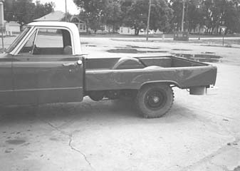 Richard McNiff, Franklin, Neb., cut down the sides of the box off a 1961 Chevrolet 3/4-ton pickup and also unbolted the bed and mounted it down between the wheels of his 1972 Chevrolet 3/4-ton pickup.