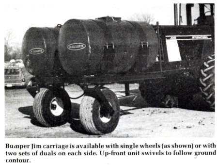Bumper Jim units can be fitted to both 2 and 4-WD tractors. The largest 1,000 gal. unit (two 500-gal. tanks) weighs 1,200 lbs. (without the tanks). Carriages for two 400 or two 300 gal. tanks are also available. Tanks generally are used for herbicides but can also be used for liquid fertilizers and insecticides.