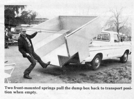 The dump box fastens to the pickup bed with two bolt-down, quick-release brackets between the rear box posts and slides on rollers. To dump it, just roll the box out the rear till the load is over center and it dumps itself. A pair of coil springs, fastened to the front of the dump box, pulls it back to its normal travel position when empty.