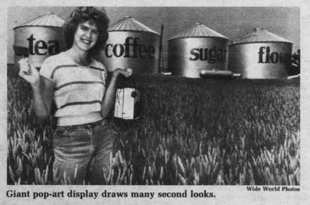 Using stylized lettering of the type often found on kitchen canisters, Carol painted up four bins to read "tea", "coffee", "sugar" and "flour". The giant pop-art display prompts nearly everyone driving by to stop and take a second look.